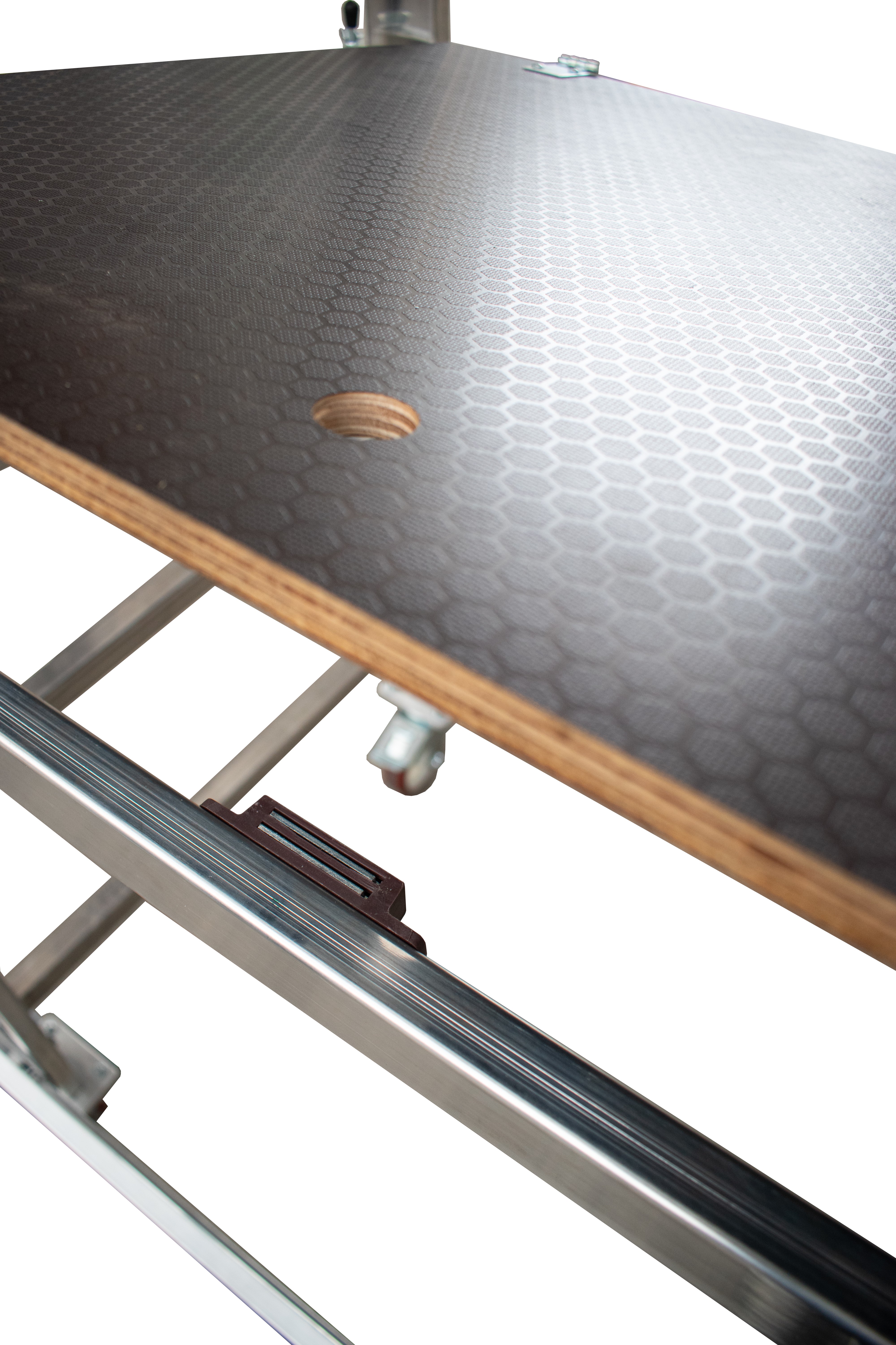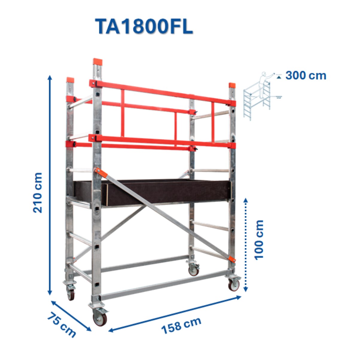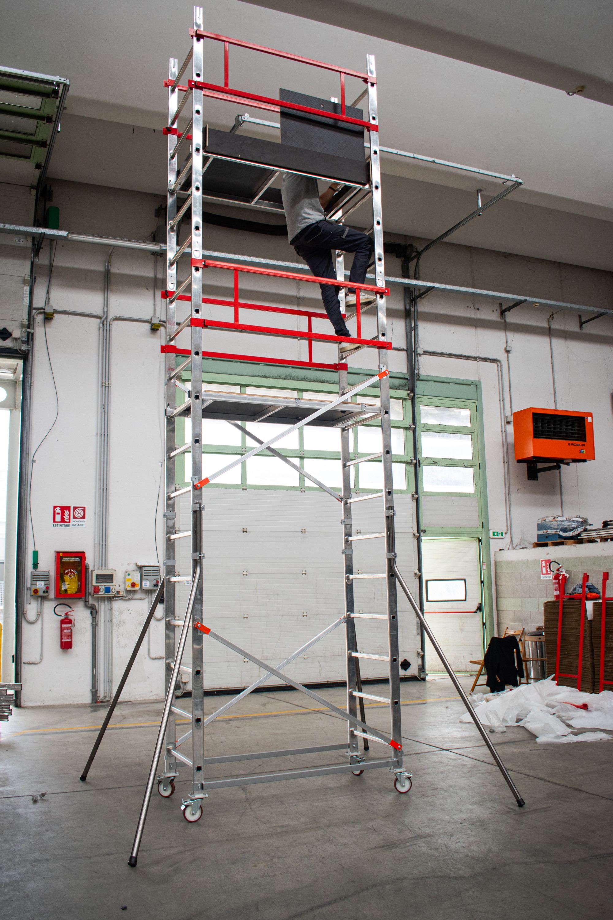 Andamio profesional con plataforma de trabajo de madera Eurodeck de superficie antideslizante, resistente a la intemperie con barandilla de seguridad y trampilla, estabilizadores con sistema de bloqueo rápido, ruedas con freno total.