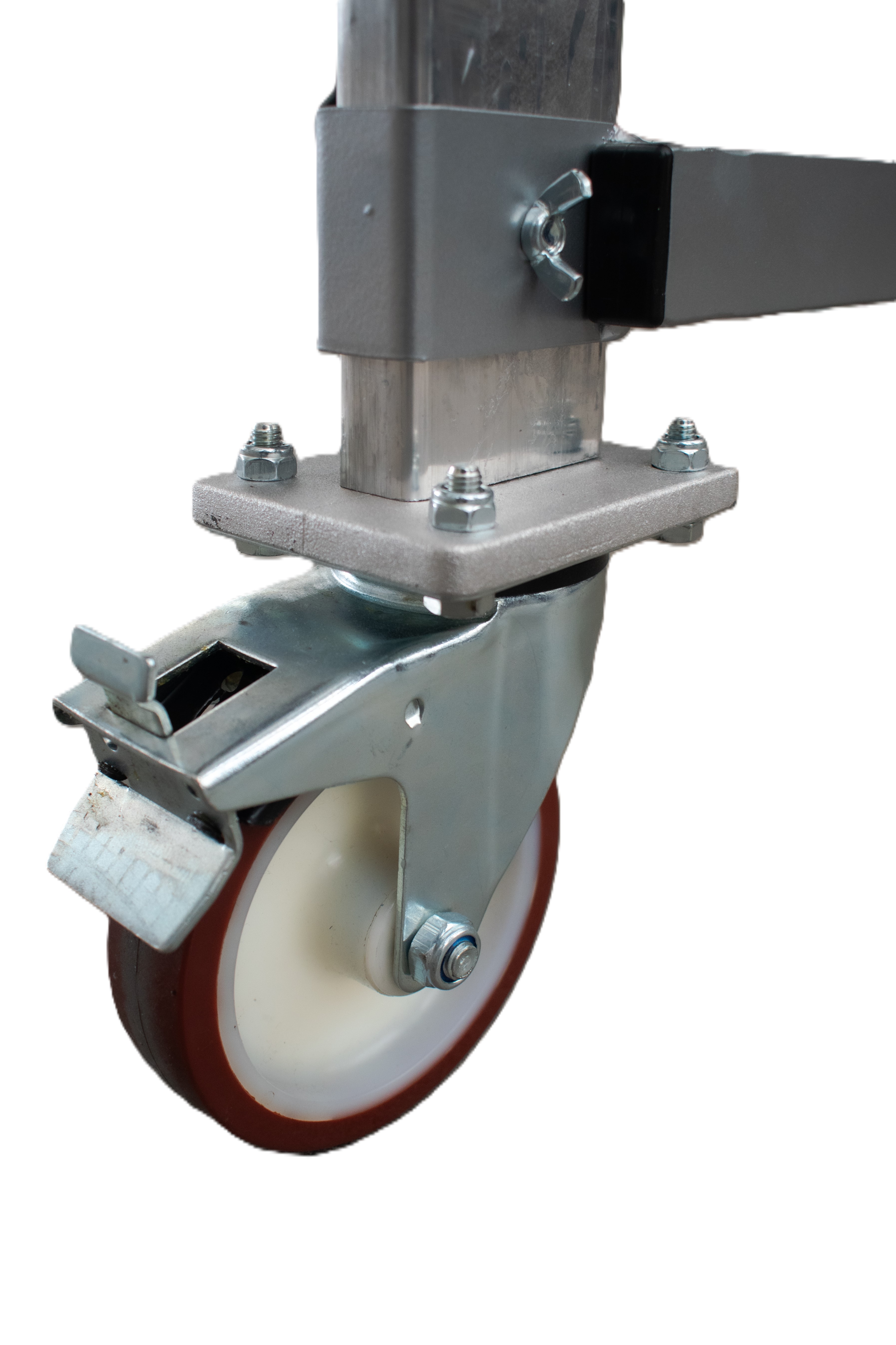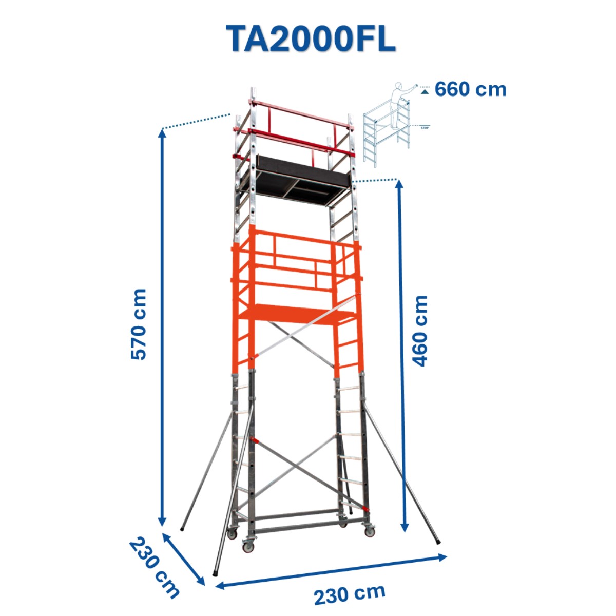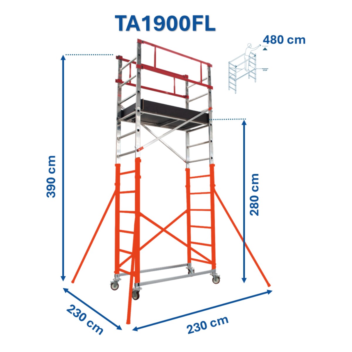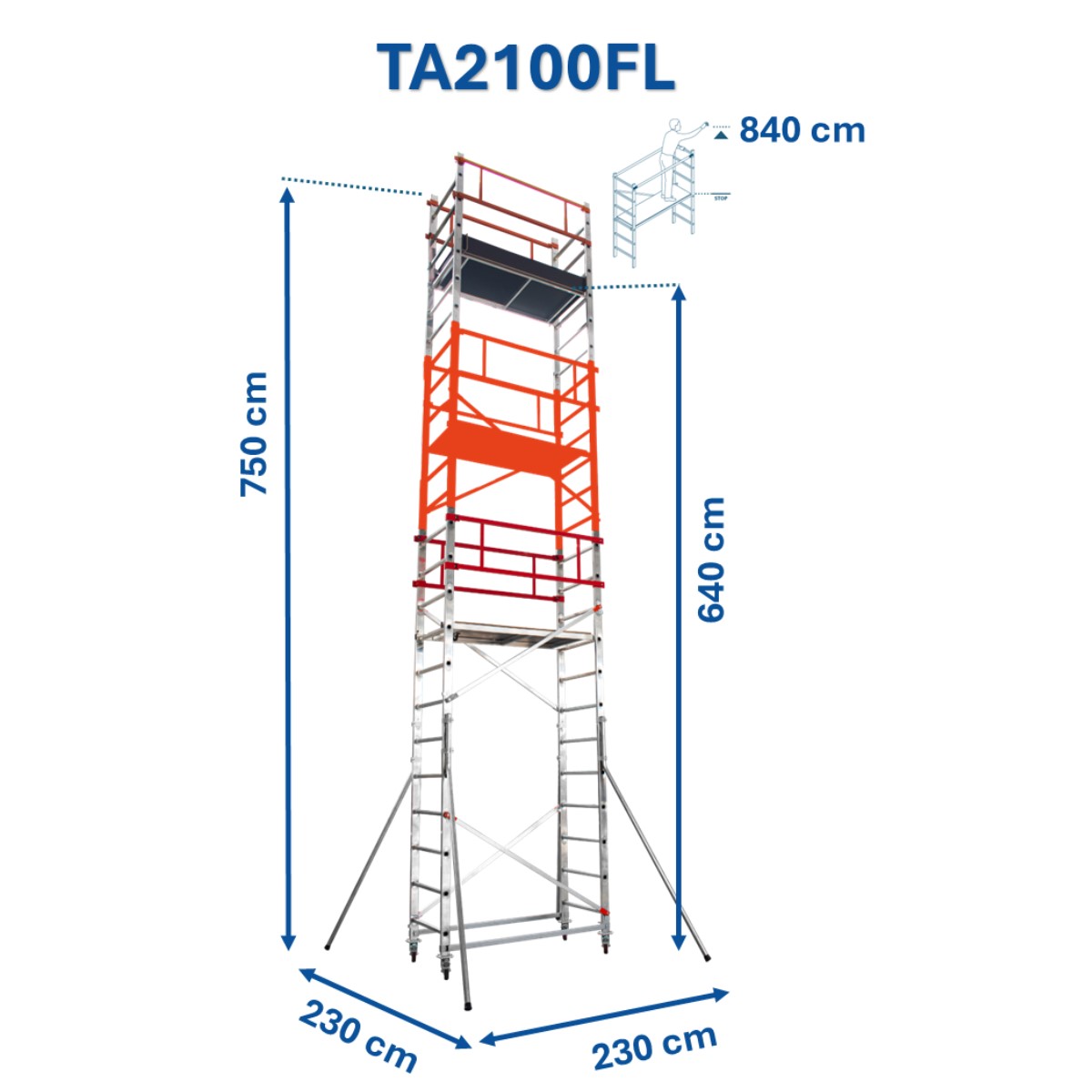 Andamio profesional con plataforma de trabajo de madera Eurodeck de superficie antideslizante, resistente a la intemperie con barandilla de seguridad y trampilla, estabilizadores con sistema de bloqueo rápido, ruedas con freno total.