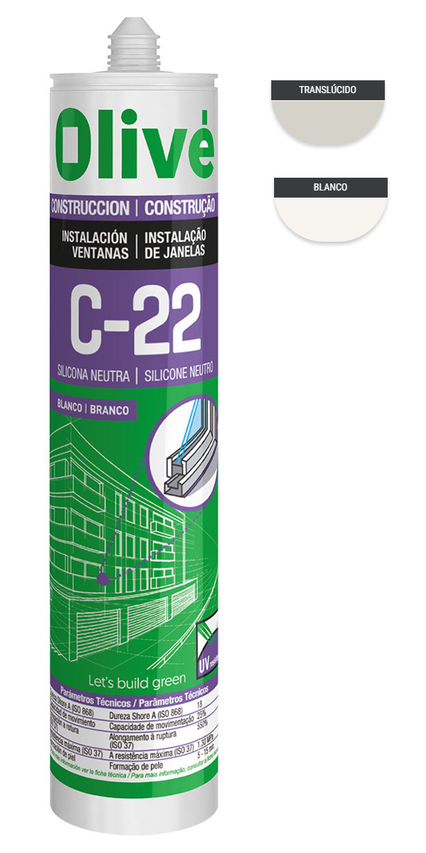 OLIVÉ C-22 es una silicona neutra de alta calidad, monocomponente, que en contacto con la humedad atmosférica se convierte en una junta elástica extremadamente resistente.