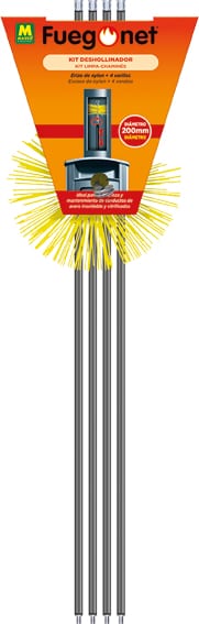 KIT DESHOLLINADOR 4 VARILLAS 5,6 m + ERIZO DE NYLON Ø200 mm El kit fuego net para la limpieza mecánica de los conductos de salida de humos en tubos de acero inoxidable y galvanizado Contiene: 1 Erizo de Nylon : Ø200 mm ROSCA METRICA 12 mm. 4 Varillas de polipropileno 1400 mm Para mayor seguridad recomendamos las siguientes pasos: 1 Aplicar el tubo deshollinador y el tronco deshollinador fuego net para eliminar los alquitranes , hollines y pavesas. 2 Realizar una limpieza mecánica con los erizos y tubos eliminando los hollines , alquitranes y pavesas que se hayan podido quedar incrustrados en los tubos Nunca realizar esta operación con la chimenea caliente