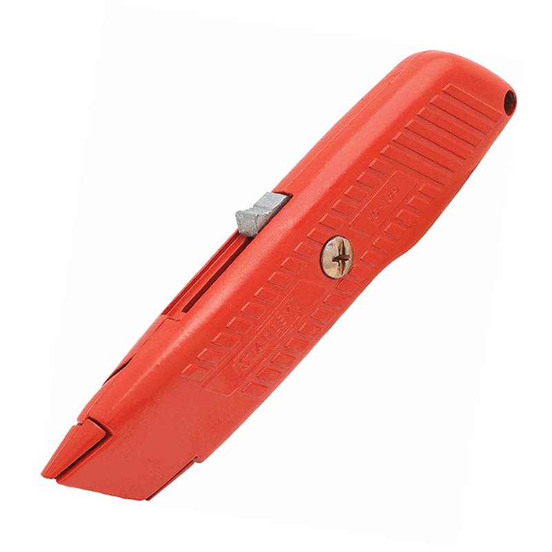 Cuchillo de hoja retráctil con cuerpo en metal. Incorpora muelle para la entrada automática de la hoja. Fijación de la hoja de alta seguridad.