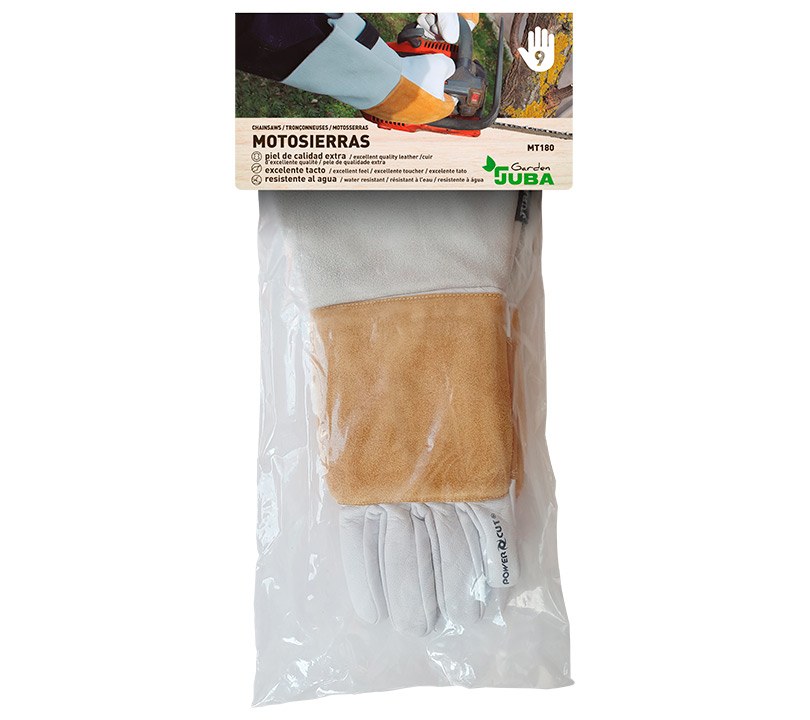 Piel flor cabra con refuerzo en piel de serraje vacuno y búfalo con manguito y puño elástico interior. Protección anticorte por sierra de cadena en dorso y dedos.