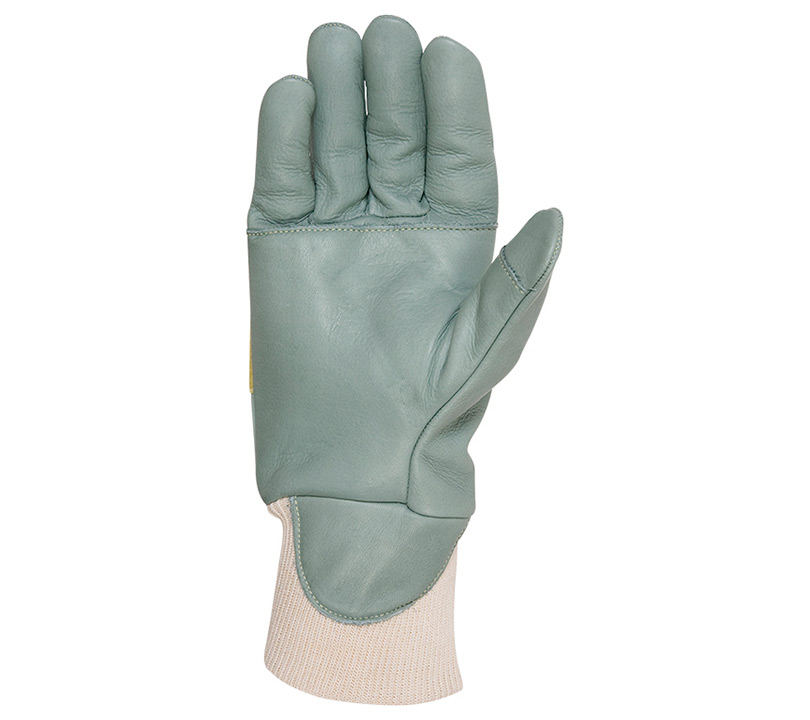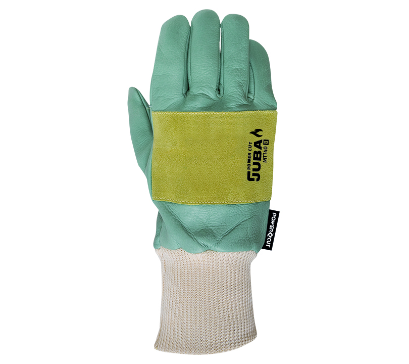 Guante de piel flor vacuno hidrofugado con protección anticorte por sierras de cadena en dorso y puño elástico.