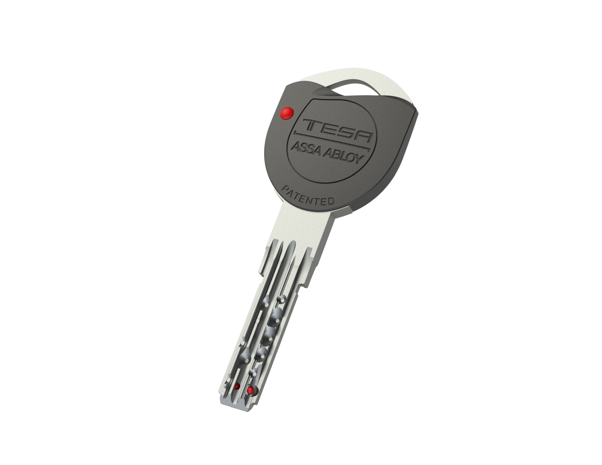 Llave tallada patentada del cilindro TK100. Llave tallada específicamente a un código concreto de cilindro TK100 que permite accionar la cerradura y abrir la puerta. Al ser patentada, es necesario presentar la Tarjeta de Propiedad para solicitar una copia de esta llave.