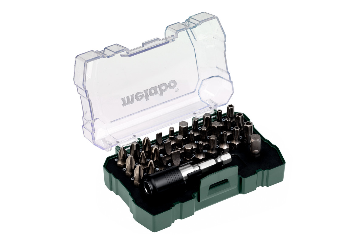Puntas de acero al cromo vanadio (calidad S2); portapuntas magnético; con adaptador para llaves de vaso con eje hexagonal (adaptador para nuez insertable); robusta caja de alta calidad con diseño especial Metabo